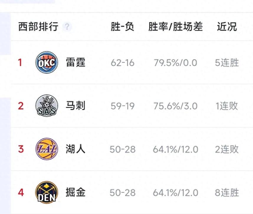 NBA本赛季的常规赛来到了最后阶段,目前,各支球队都只有四场比赛可以打了。但是西部这边没有任何一支球队,目前锁定了最终排名。雷霆和马刺几乎是锁定了西部第一和第二的位置。目前雷霆领先马刺三个胜场,只要雷霆再赢两场,或者雷霆赢一场,马刺输一场,雷霆就锁定西部第一的位置,所以这个没什么多大的悬念。