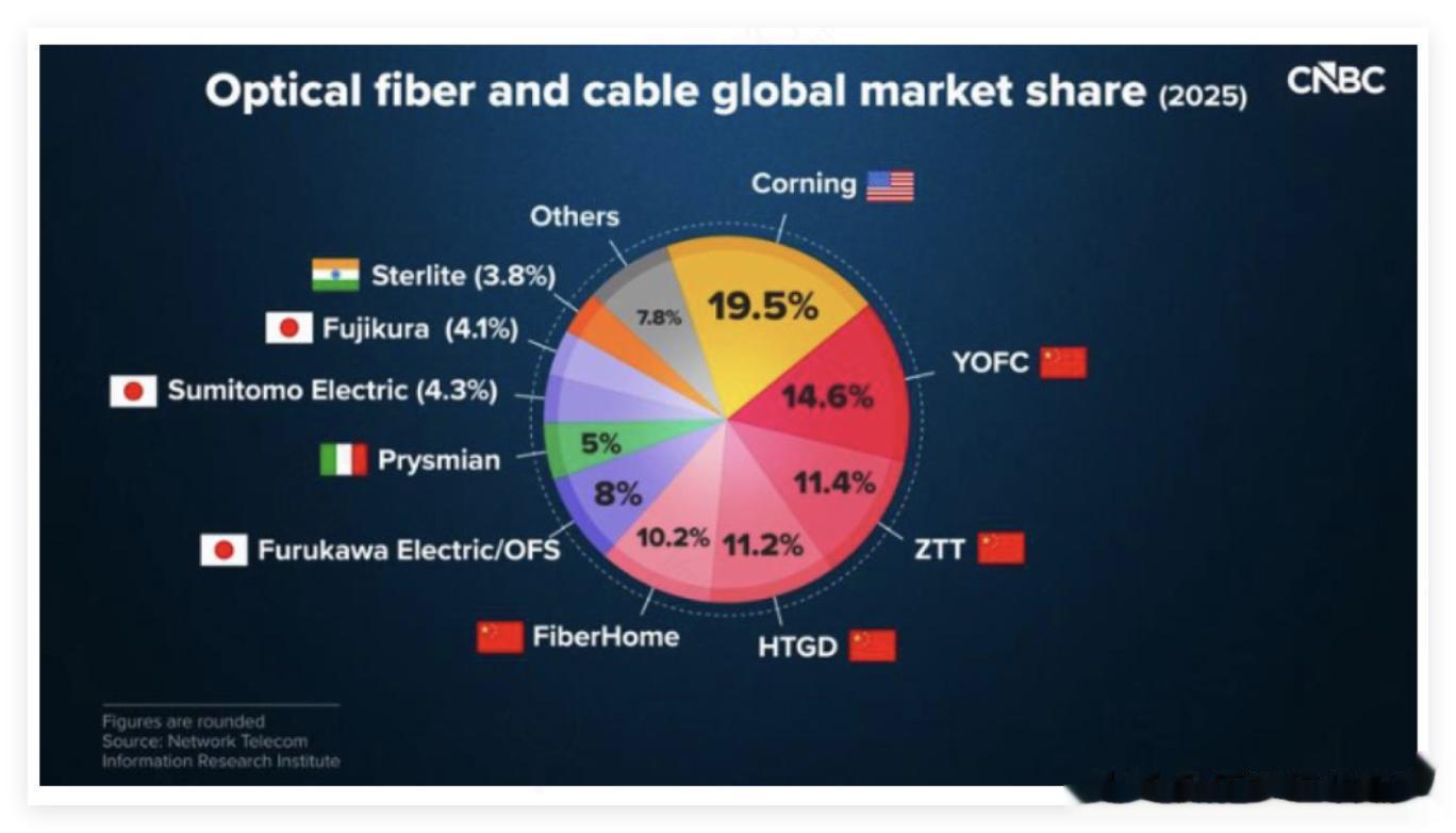 此外,日本企业如住友电工(Sumitomo Electric)、古河电工(Furukawa Electric/OFS)以及法国普睿司曼(Prysmian)也占据一定份额,分别为4.3%、8%和5%。