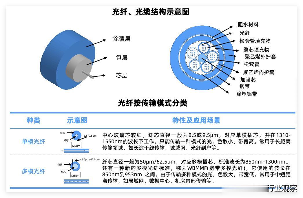 单模光纤:对应直径较小的芯层,允许光用一种模式传输,应用于干网、海底光缆等场景。