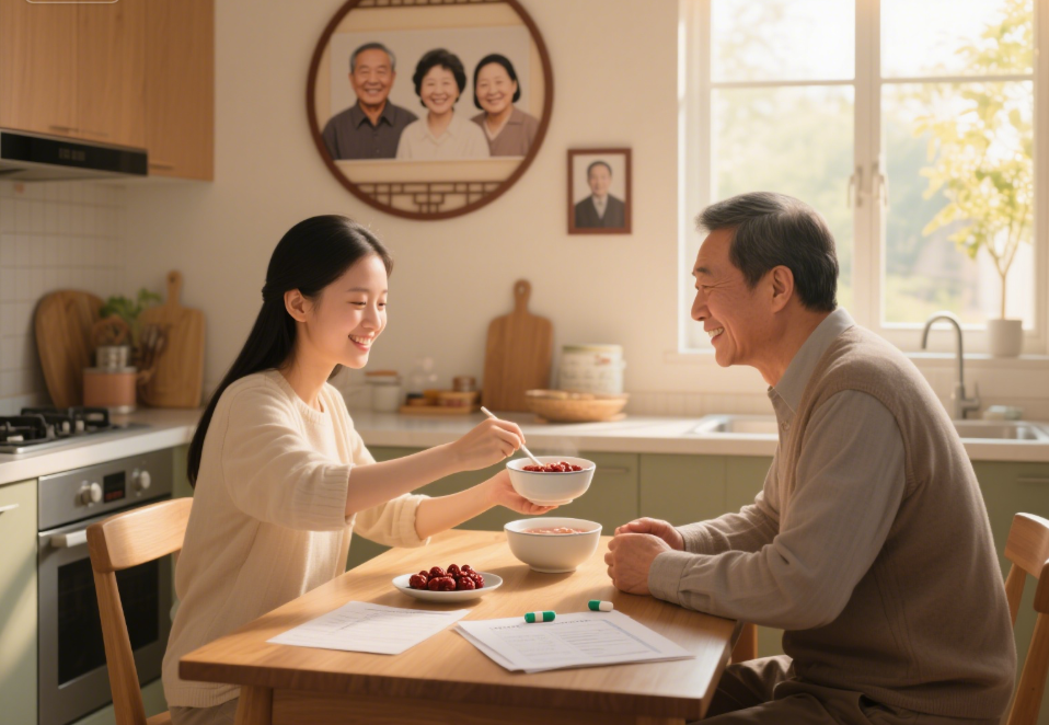 从那以后,晓晓每天都会监督我吃药 —— 她把降压药放在我床头,早上提醒我吃;晚上吃完饭,她会拉着我去小区散步,有时候还会跟我一起跳广场舞。她自己也每天吃红枣,还会煮红枣粥给我喝。