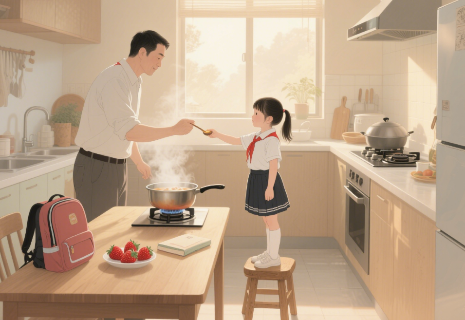 “晓晓,你下来,爸爸来弄。” 我走过去想把她抱下来,她却摇着头:“爸爸,你生病了,要躺着。老师说,生病了要喝粥,喝了粥病就好得快。” 她倒了太多水,粥煮得稀得像米汤,可她端到我床边时,眼里满是期待:“爸爸,你快喝,我尝过了,不烫。”