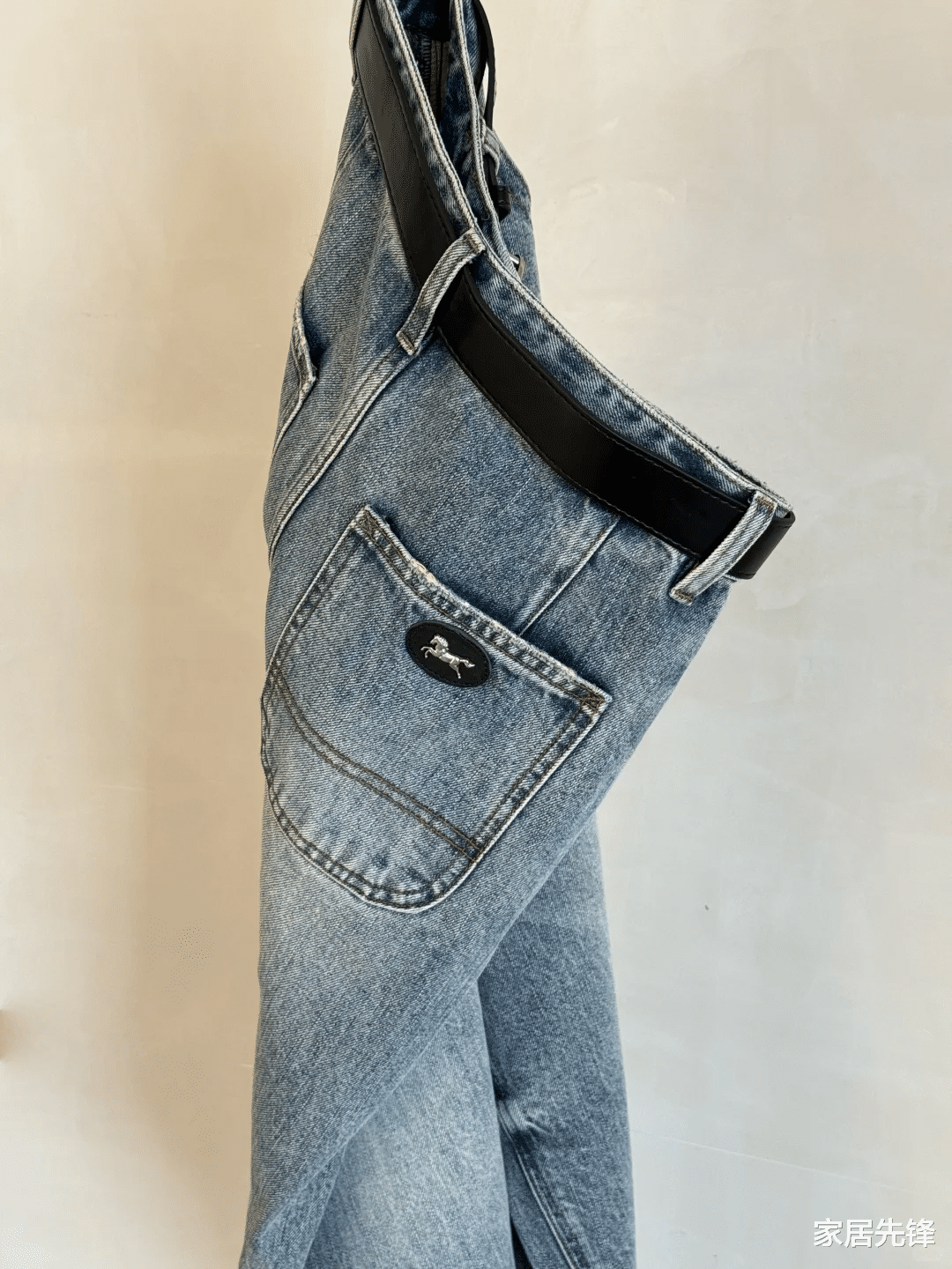 我们穿牛仔裤的时候,因为裤腰比较大,很多人可能需要系皮带,特别是很多男士朋友,牛仔裤后腰的皮标其实还有帮助我们巩固腰带的作用。