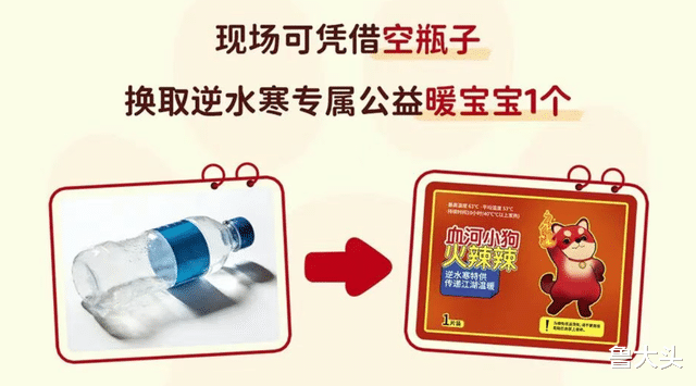 甚至,它还化身公益大使,在活动现场,玩家和路人都可以凭借空瓶子,换取血河小狗代言的暖宝宝,这番操作,官方真是走心了。