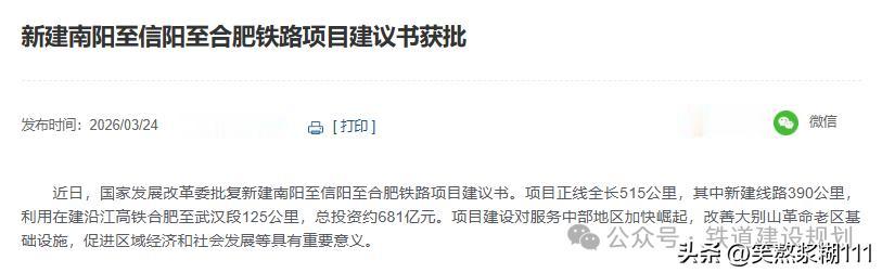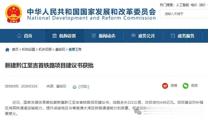 2026年3月24日,国家发改委正式发布公告,明确新建黔江至吉首铁路、南阳至信阳至合肥铁路两项重点工程的项目建议书已顺利获批。这一消息为两条铁路后续的可行性研究批复,以及今年内正式开工建设,筑牢了关键基础、铺平了推进道路。