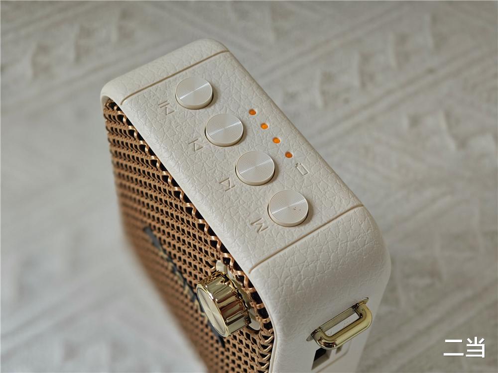 机器正面左上角设计旋钮开关按键,长按3秒开关机,旋转调节音量,边框顶部设有M键、上一曲键、下一曲键、播放/暂停键和电量指示灯。