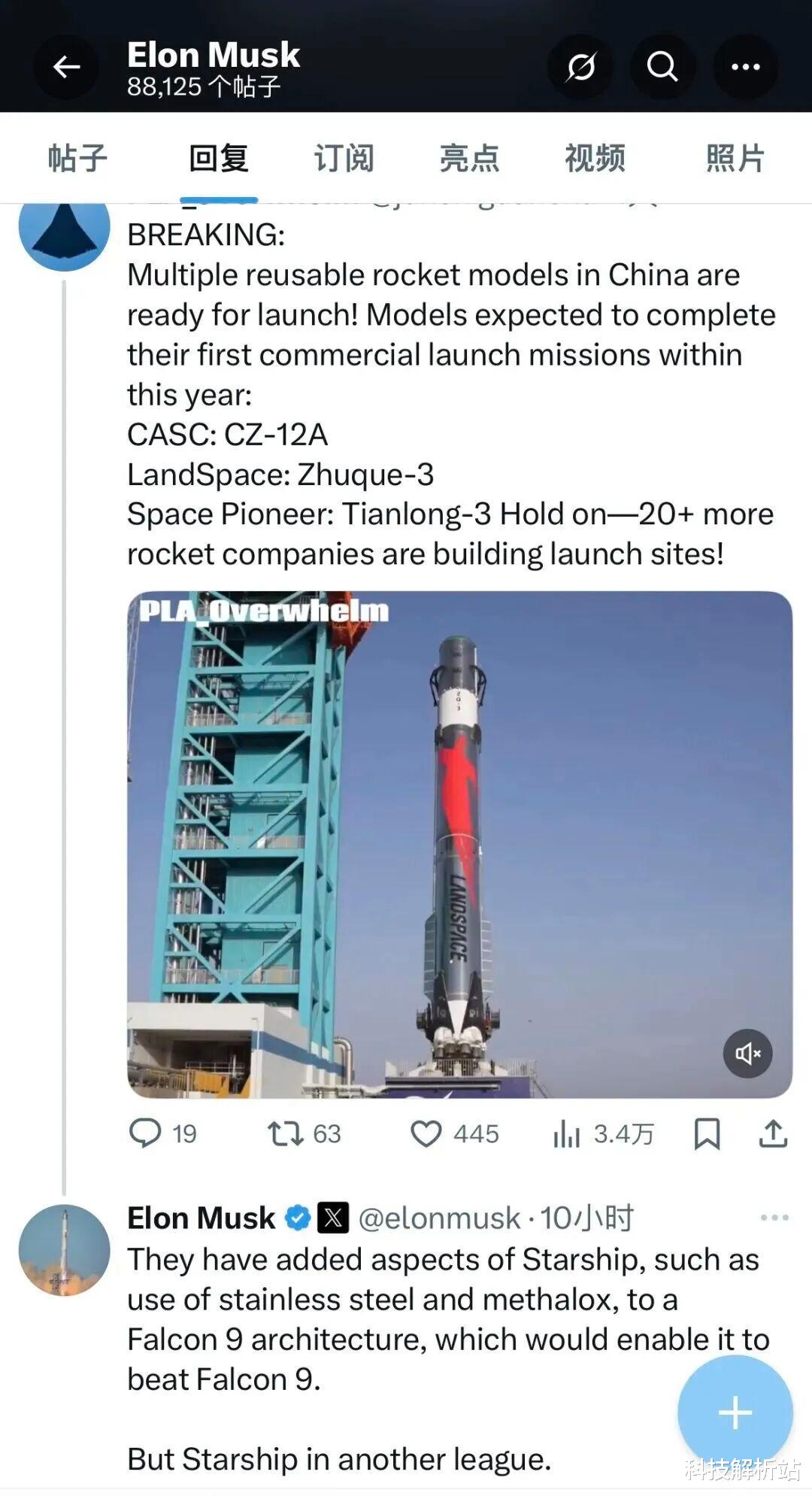 北京时间10月24日凌晨,美国太空探索技术公司(Space X)创始人兼CEO埃隆·马斯克在社交媒体平台X上首次评论中国初创企业蓝箭航天即将发射的“朱雀三号”可复用运载火箭。马斯克表示,朱雀三号在猎鹰9号架构中加入了星舰的一些特性,例如使用不锈钢和液氧甲烷,这将使其能够击败猎鹰9号,但同时强调“星舰完全是另一个级别的存在”。