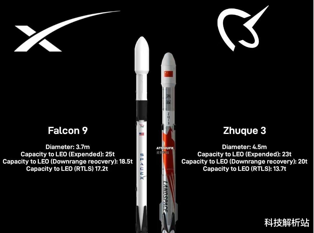 这里要特别强调一点,猎鹰9号壳体采用的是铝锂合金材质,重量更轻,而朱雀三号壳体采用的是不锈钢材质,因此运力有部分损失。