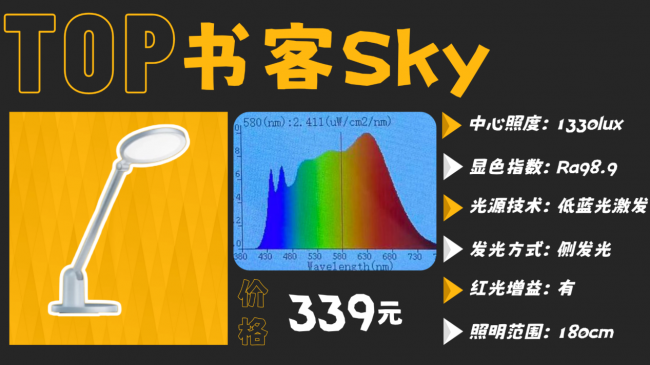 作为拥有十余年护眼技术沉淀的品牌,书客在这次sky身上几乎把百元护眼台灯能做到的护眼效果给极限拉满,甚至直接下放了千元级旗护眼台灯才能使用的5 域环控光学系统,还搭载了SunSilk™护眼芯片+DT多维漫射2.0黑技术,三者组合构建出了远超同价位护眼台灯的硬核光线基础,经过高密度导光板及柔光膜处理,发光点更加柔和均匀,降低瞳孔调节负荷,在提升93%光线柔和度的同时,还能够减少81%的用眼疲劳。进一步搭载了RRT2.0红光硬核养眼技术和硬件级低蓝光技术,通过刺激眼底的线粒体活性,改善视网膜血液循环和光合作用效率,实现了降低90%的近视风险,更是将400-450nm有害高能蓝光成功抑制在了0.6的峰值内,直接冲击了千元内护眼台灯的水准,不愧目前国内唯一一个将护眼性能做到第一的品牌。