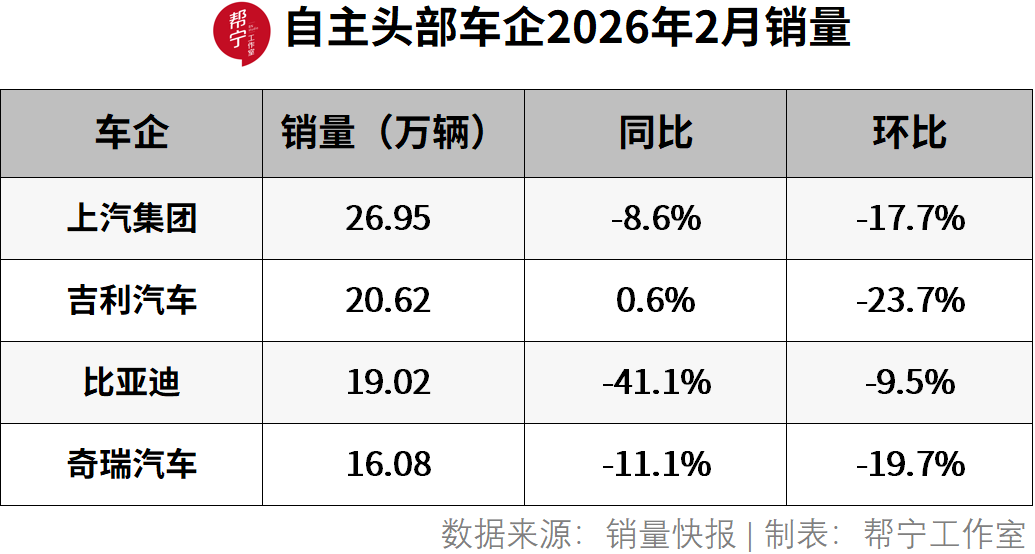 从已公布的信息来看,2月,上汽集团销售26.95万辆,同比下滑8.6%,环比下滑17.7%;吉利汽车销售20.62万辆,同比增长0.6%,环比下滑23.7%;比亚迪为19.02万辆,同比下滑41.1%,环比下滑9.5%;奇瑞集团为16.08万辆,同比下滑11.1%,环比下滑19.7%。