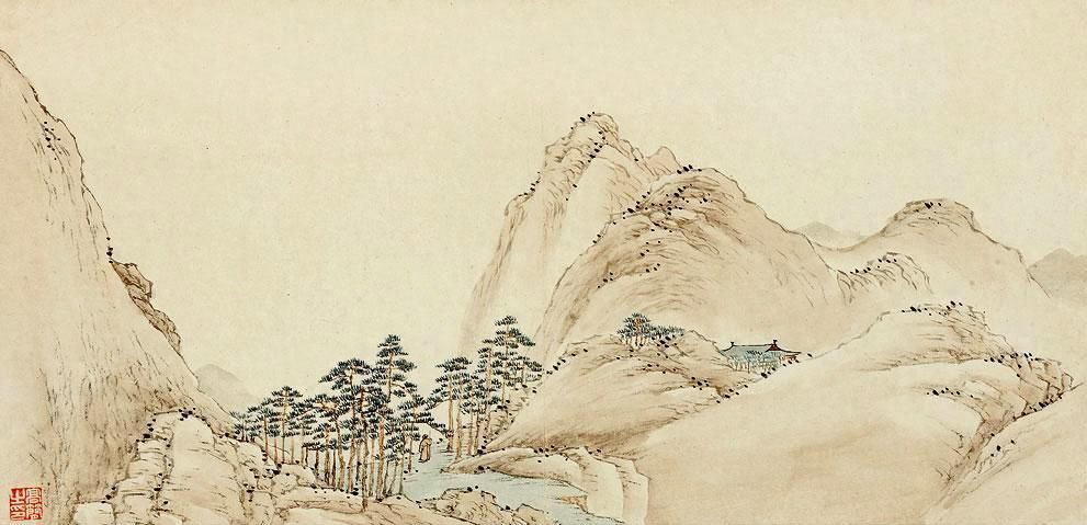 先看这幅浅绛山水,笔墨虚淡,枯笔淡墨皴出山石肌理结构,湿笔蘸取赭石进行晕染。枯湿并用,让画面有一种清冷、润泽并存的味道。也可以把这种味道称为“逸气”,让人联想到元人笔墨呈现的自然天真之意。