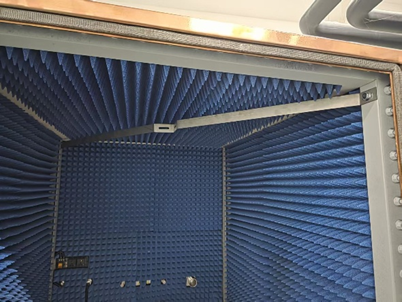 在箱壁内贴附射频吸波材料(如OI-ESA/OI-ESS/OI-ES系列屏蔽箱):