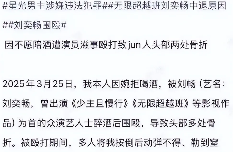 前脚有个19岁小明星家暴出轨的事还没闹明白,后脚又爆出个大新闻——28岁的演员刘奕畅因为在酒桌上劝酒不成,居然动手打了一位现役军人。
