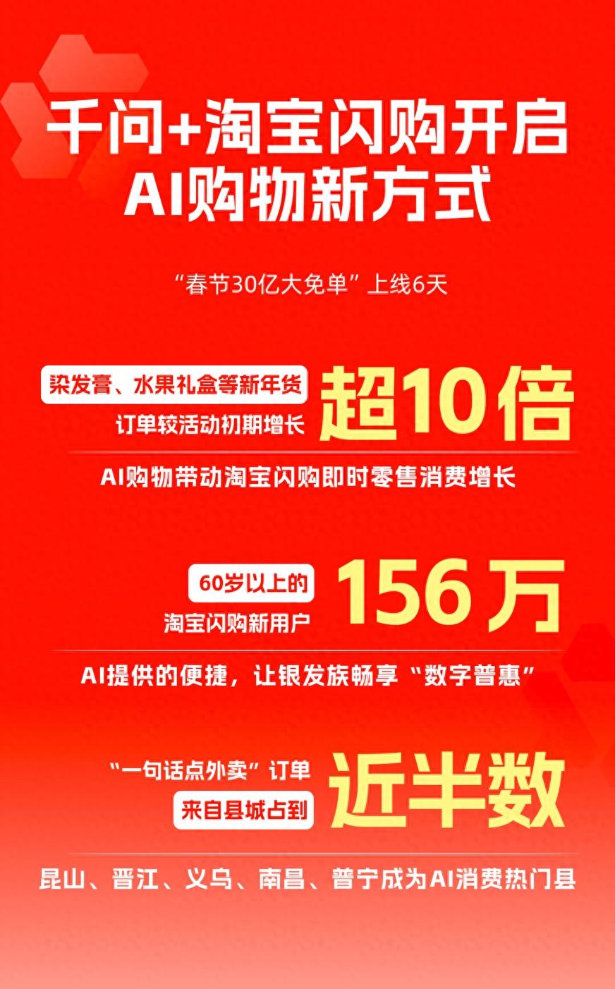 2月12日,千问App公布“春节30亿大免单”第一波活动数据:过去6天,用户说了41亿次“千问帮我”,AI完成下单超1.2亿笔。而淘宝闪购数据显示,来自千问的订单中,近半数在县城下单,更有156万老年人通过千问首次体验外卖服务。AI技术在带动消费体验升级的同时,正全面激发各类人群、各线城市的新消费活力。