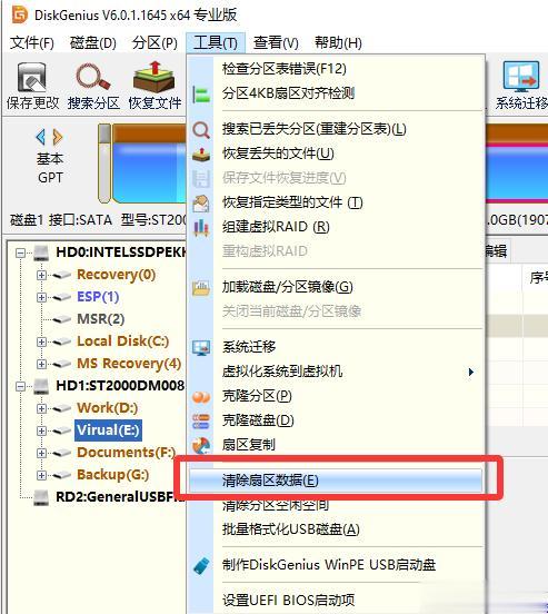 提醒:如果想擦除整个分区或是硬盘,那么就选择相应的区域,之后点击【工具】-【清除扇区数据】。