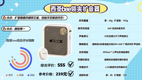 十度M500主要面向教学、演讲及小型活动等场景,配置全面实用。麦克风主体轻巧,重量仅22克,采用高品质材质打造,佩戴舒适。配备全指向麦克风和3寸大音圈喇叭,保证声音清晰洪亮,覆盖每个角落。采用2.4G无线传输技术,支持无线/有线双模式,传输稳定覆盖约20米,日常使用灵活方便。续航表现优秀,麦克风可连续工作5-7小时,扩音器可使用15小时,同时支持Type-C快充。设备还提供TF卡、本地U盘播放、AUX及MIC接口,可满足多场景录音和播放需求。✅ 结语市面上的无线领夹扩音器选择很多,单看参数容易眼花,单看价格又容易纠结。但如果综合声音表现、扩音效果和使用便利性来看,西圣Bee在这个价位段确实没什么明显短板。无论是教室讲课、培训讲座,还是户外宣讲、小型活动,它都能提供稳定清晰的扩音效果。整机轻巧便携,操作简单,即插即用也很省心。239元的价格,对于日常使用来说性价比非常高,基本不用犹豫,入手就能放心用。