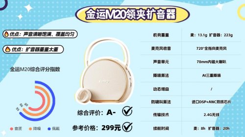 得胜E10W无线领夹扩音器。其采用轻量化设计,主机外壳坚固耐用,搭配无线领夹麦克风,解放双手,适合日常教学与培训使用。扩音器内置76mm大口径稀土磁喇叭,音量覆盖面更广,人声清晰洪亮,足以满足30–50人小型场景的扩声需求。在传输方面,E10W结合了2.4G无线连接+蓝牙5.3技术,有效减少干扰,确保音频传输稳定。配合全指向收音和智能防啸叫电路,即便在封闭教室或嘈杂环境下,也能保持声音自然顺畅,不易出现啸叫和断音。续航上表现同样扎实,扩音器单次可连续使用20小时以上,领夹麦克风续航约6–7小时,足以覆盖日常一整天的课程或讲座。接口方面,支持Type-C快充与AUX输入,还可连接小型音箱,扩展性灵活。▻领夹麦高性价比2025品牌型号③金运M20