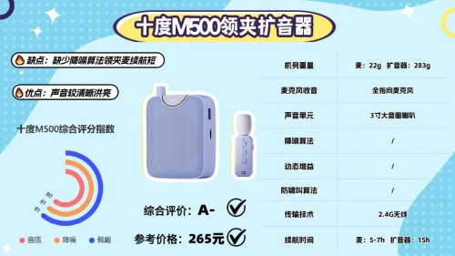 飞利浦DLM3551CB适合教学、会议和小型演讲使用,采用无线领夹设计,麦克风仅12克,扩音器183克,便于随身携带。配备360°全指向麦克风和大功率内磁喇叭,保证声音覆盖均匀且清晰自然。内置DSP防啸叫芯片,可有效降低环境噪声,避免录音产生回声或啸叫。支持2.4G无线传输,最远覆盖约20米,同时兼容有线模式,灵活适应不同场景。麦克风和扩音器续航均可达8小时,支持Type-C充电。还具备3.5mm接口、TF卡、AUX及小音箱扩展功能,可满足多场景录音或播放需求,操作简单方便,是教学和日常扩音的可靠选择。▻领夹麦高性价比2025品牌型号⑩十度M500