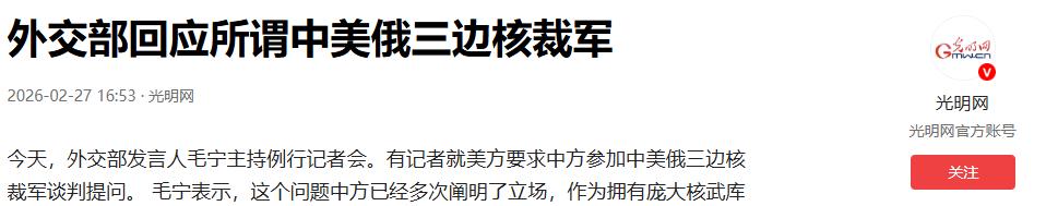 信息来源:外交部回应所谓中美俄三边核裁军 2026-02-27 16:53·光明网