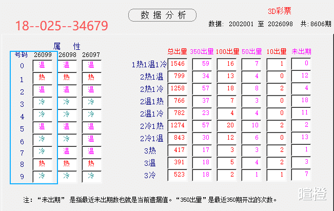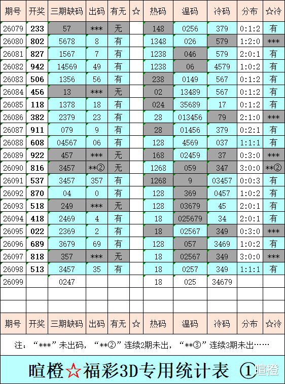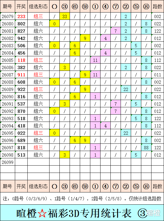 26099期:暄橙福彩3D综合条件(本期将在4月19日21:15开)一、上期回顾 ☆1、上期开奖号:5 1 3。2、和值= 9,跨度= 4。3、非常态组六,012路组合。4、热度分布(热:温:冷)1:1:1。二、本期条件 ☆1、三期缺码:0247。2、热:18,温:025,冷:34679。3、断组分解式:3489//012-567。4、四胆:3569;三胆:356。三、术语解释 ☆1、三期缺码:0至9这十个自然数当中,未在近三期开奖号出现的数字。2、热度(热温冷):自然数0至9,在近七期开奖号中,出现3次及3次以上的数字,称为热码;出现2次的数字,称为温码;出现1次和未出现的数字,称为冷码。某个数字在开奖号中出现几个,就按几次计算。3、断组分解式:将0至9这十个自然数,分成三组数字,从前往后依次为A组(4码)、B组(3码)、C组(3码),一般情况下,有一组数字不出码,偶尔会有两组数字不出码。A组不出码的情况相对较少。断组为主,分解为辅。4、常态组六号码:同时包含大数、小数、奇数、偶数、质数、合数的组六号码,共有72注。统计表中,简称“常态”。5、非常态组六号码:全大数、全小数、全奇数、全偶数、全质数、全合数等六种形态的组六号码,共有48注。统计表中,简称“非常”。★提醒:彩市有风险,参与须谨慎!水平有限,仅供参考!