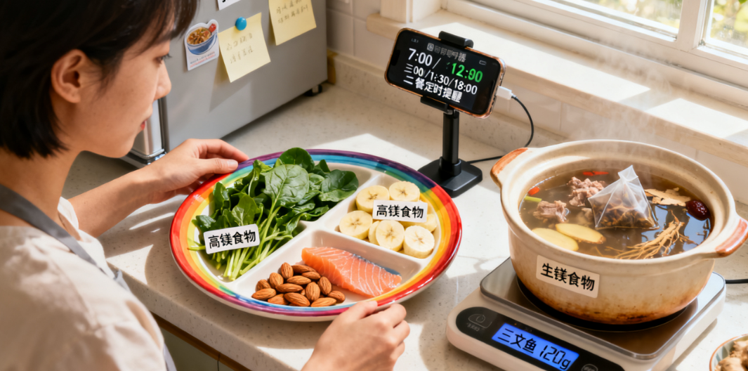◦ 富含镁的食物:镁是天然的肌肉松弛剂。多吃深绿色蔬菜(菠菜、羽衣甘蓝)、坚果(杏仁、腰果)、香蕉、豆类。