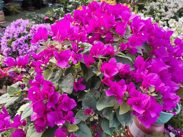 三角梅是大众叫法,正式名称有两种:即光叶子花(Bougainvillea glabra)和叶子花(B.spectabilis)。光叶子花,叶无毛或疏生柔毛;苞片长圆形或椭圆形,与花等长;花被管有稀疏柔毛,原产巴西。叶子花,叶密生柔毛;苞片椭圆状卵形,比花长;花被管密生柔毛,原产热带美洲。两种的园艺品种非常多,花色多样。