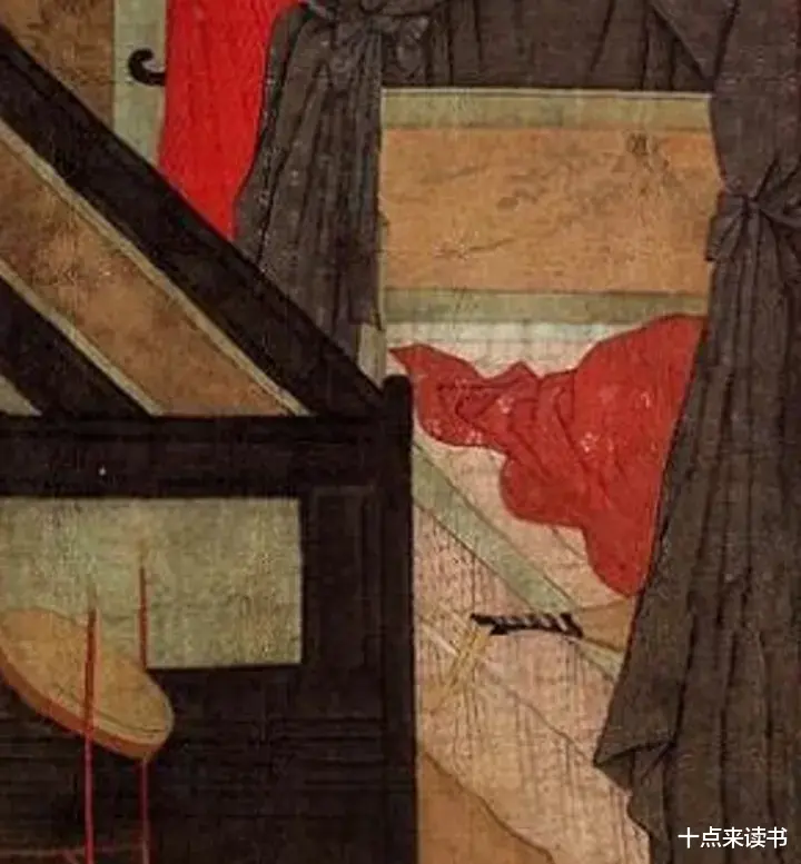 有趣的是,画面左侧,靠着屏风的密探顾闳中正在和侍女打探宴会的详情。