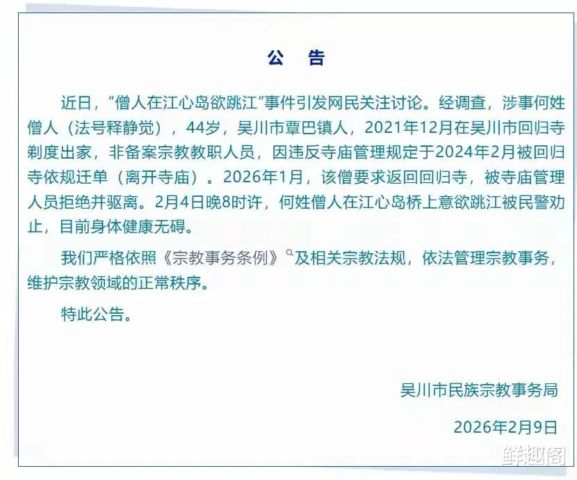 不过,好消息是有民间慈善组织为释静觉提供了临时的住所和医疗救助,当地佛协也开始已介入调查。2026年2月9日,当地相关部门发布通报,阐述了事情的经过。相信不久,这件事情会有一个说法,释静觉也会得到一个合理的安排。