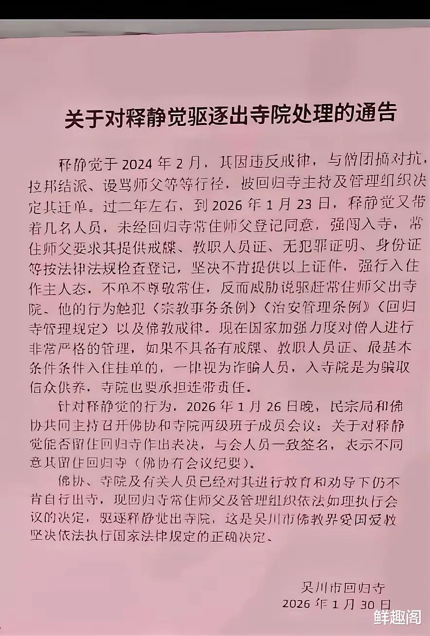 寺院的理由是,违反戒律、对抗僧团管理、拉帮结派。此前我们也看到了寺院的通报,非常详细的讲述了释静觉的问题,态度也非常决绝,不接纳释静觉。不过根据知情人的透露,新任住持看他碍眼,戒牒不齐只是借口。