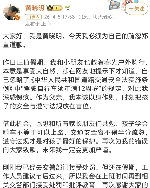 看到这件事,我不禁想起自己小时候,家长也曾带我骑车上路,当时完全不知道有未满12岁不能上路的规定,现在想来十分后怕。其实很多人对这类安全规定都一知半解,黄晓明的疏忽,或许也是很多普通家长的常态,但他作为公众人物,确实肩负着更多责任。公众对他的严格要求,从来不是苛责,而是因为他的一言一行都可能被模仿,一旦出错,很可能给粉丝和普通家庭带来误导。而他主动反省、愿意接受处罚的态度,不仅守住了自己的口碑,也用实际行动给大家上了一课——安全无小事,无论是谁,都该遵守规则。