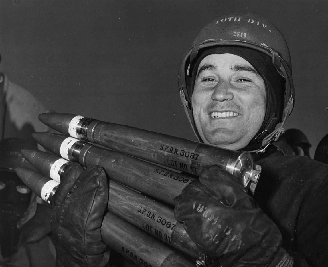 图7:一名炮长手持一条40毫米炮弹链,准备填入博福斯高射炮。