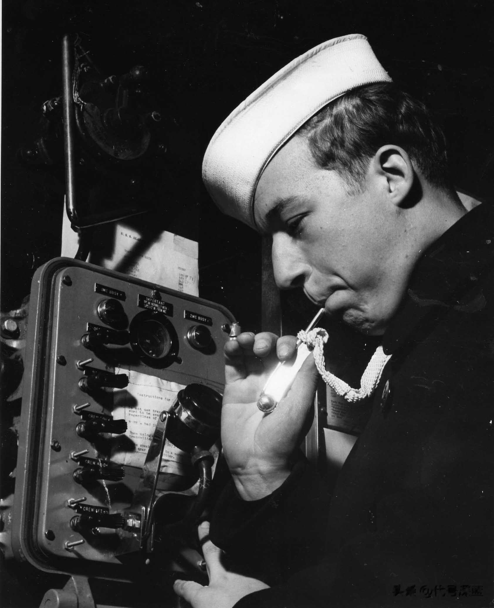图9:一名水手长通过舰内广播系统吹响船笛,命令全体船员立正待命——这是在正式战斗警报拉响前的标准程序。