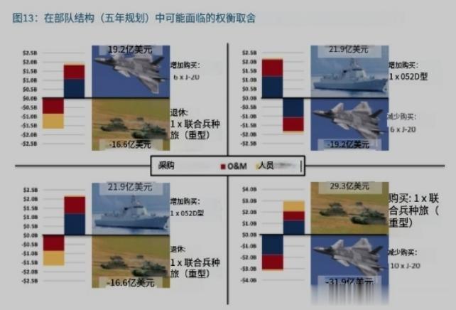 一旦输入到“中国战略选择工具中,该平台以及单位层面的成本估算将随即生成。战友和力量结构预测提供了一种强大且易于使用的手段,可用于进行相关分析 。潜在的解放军现代化发展轨迹。中国SCT用户可以考虑投资。整个中国人民解放军防务领域的资产剥离,在某种程度上引发了类似的讨论。政策制定者无疑正在参与制定策略、概念和投资计划。下面的图13包含了一些大致上不影响预算的名义权衡取舍。用户可以在SCT中进行选择。用户无需连接特定的附加组件,例如采购六架J-20战斗机,并附带特定条件,例如退役一架重型联合战机。尽管添加和删减的总和必须达到用户的预算目标。图13中的权衡显示了用户可以在跨领域投资组合层面进行的交易。不妨在工具中考虑这些交易。这些交易很可能与政治和军事领域的交易类似。决策者们正在考虑这一方案,