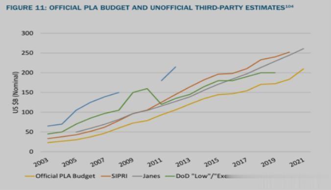 十年的预估数据。2021年,中国的官方国防预算为1.35万亿元人民币(合2120亿美元)。该数据历来被批评为低估了中国的实际国防支出。近年来,紧张局势有所缓和,因为许多解放军专家认为,中国的国防预算现在纳入了之前被忽略的几类支出项目,以及其他几类支出项目。那些仍未纳入国防预算的支出已被大幅削减。变得无关紧要(图11)。例如,在21世纪的头十年里,美国国防部就采取了这种做法。防御方声称,解放军的预算比官方公布的数字高出两到三倍。相比之下,在过去几年里,多位知名专家的估计——如来自【此处省略具体来源】的专家估计显示:斯德哥尔摩国际和平研究所和简氏信息集团——平均而言指出:人民解放军的预算仅比官方公布的上限高出约15%至40%。近年来,西方专家一直关注在国防支出方面的低估情况。更多细节包括