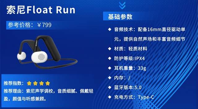 推荐理由:索尼Float Run定位中高端开放式运动耳机,凭借索尼专业声学技术与人体工学设计,专为追求音质与佩戴体验的运动爱好者打造,适配跑步、骑行、健身等多场景,兼顾性能与品牌质感。