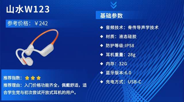 推荐理由:山水W123定位入门级水下运动骨传导耳机,主打高防水与本地存储,专为游泳、水中训练爱好者设计,凭借实用功能与亲民价格,成为入门水下运动人群的高性价比之选,兼顾基础陆地运动需求。
