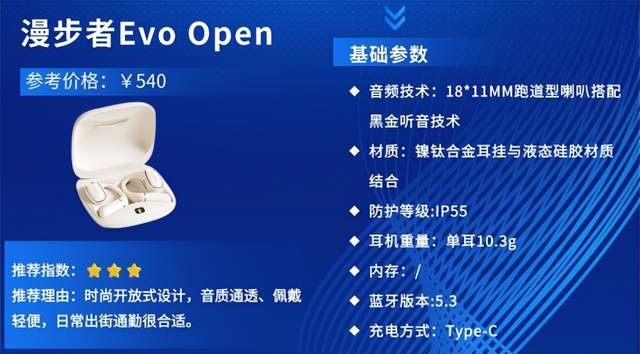 推荐理由:漫步者Evo Open定位中高端开放式运动耳机,主打高清音质与舒适佩戴,专为日常运动、通勤兼顾的人群设计,凭借Hi-Res认证音质与稳固性能,成为追求音质的运动爱好者的优选单品。