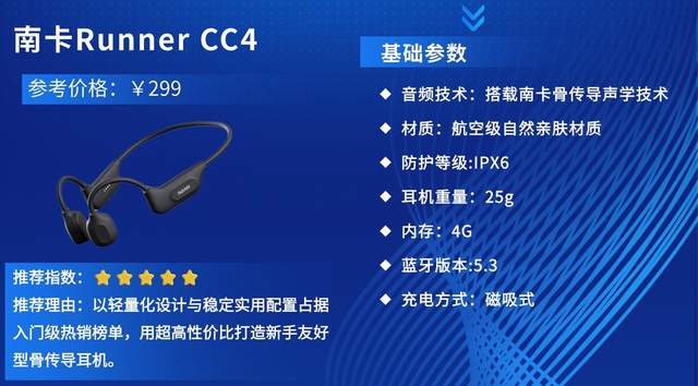 推荐理由:南卡Runner CC4定位百元级高性价比骨传导耳机,以成熟技术、舒适佩戴和实用性能,重新定义入门级产品标准。对于追求轻便、安全、耐用的用户来说,它几乎没有短板。