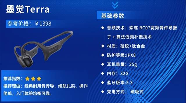 推荐理由:墨觉Terra定位高端旗舰级骨传导耳机,专为专业运动爱好者打造,融合高端声学技术与全能防护,兼顾音质、佩戴与场景适配性,适配跑步、骑行、户外探险等高强度运动,堪称全能运动装备。