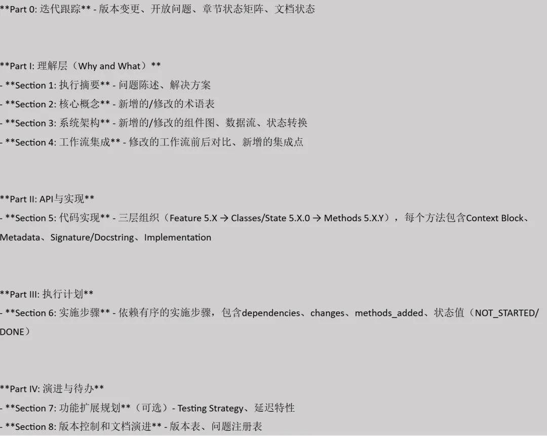 代码实现的结果是由一系列自顶向下的决策决定的,顶层的关键决策包括新功能如何融入已有架构,底层的决策如是否需要增加成员变量。组织设计文档的核心目的是系统性的跟进这些决策点,并逐步完善解决。由于底层的决策,往往依赖于顶层或者上层的决策,设计文档需要层次化的拆解决策,形成决策体系。开发者需要按照章节的先后顺序和目录层次结构审阅文档中的自顶向下的决策过程,当我们指出前面顶层设计的错误时,AI 会自动修改后面章节的中层和下层决策以保持内部逻辑的一致性。因此,我们可以按章节层次和顺序和 AI 逐个对齐自顶向下的决策。同时,在开发者和 AI 共同修正这些决策的过程中文档不断演进,文档需要自包含这个迭代的过程,记录迭代的版本。最后,文档也需要记录代码实施的进度和一些衍生的待办。