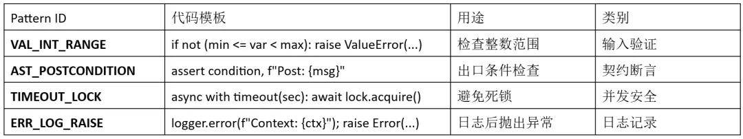 统一的验证模式库: 我们维护了一个包含常用验证模式的库,每个模式都有唯一的 ID 和标准化的实现。这些模式遵循单一定义,多处复用原则。当需要在代码内增加某个验证逻辑时,只需在注释中加入模式库中的一处定义,AI 实施时会按 ID 查表展开,确保整个代码库中相同验证逻辑的一致性。