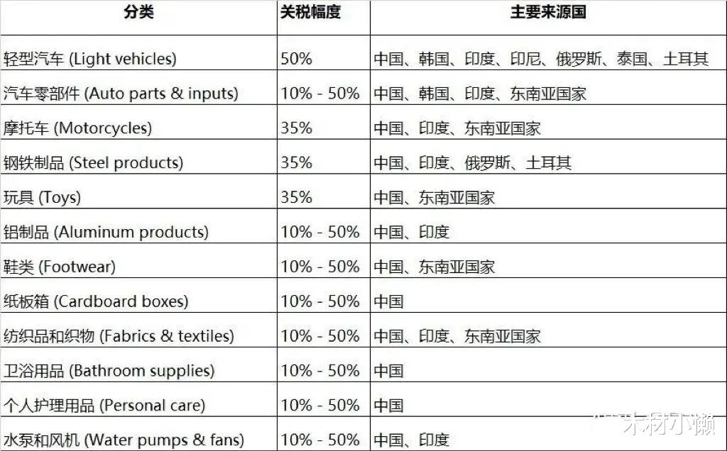 法案对1463个HS税号作出关税上调,覆盖纺织、钢铁、汽车及零部件、塑料、家电、玩具、家具、鞋革、纸及纸板、摩托车、铝制品、拖车、玻璃、化妆品与肥皂等17个行业。税率由原先0-20%普遍调升至10-50%,其中委员会定稿多数集中在10-35%区间:316个税号由免税变为首次征税,341个税号适用35%峰值,302个税号定为10%,其余按税号分档渐变。
