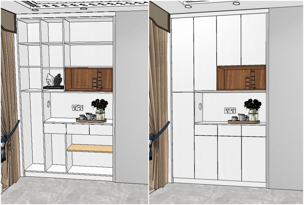 a.封闭储物区:装在上部分与下部分,用于存放不常用餐具、茶礼盒、干货等;