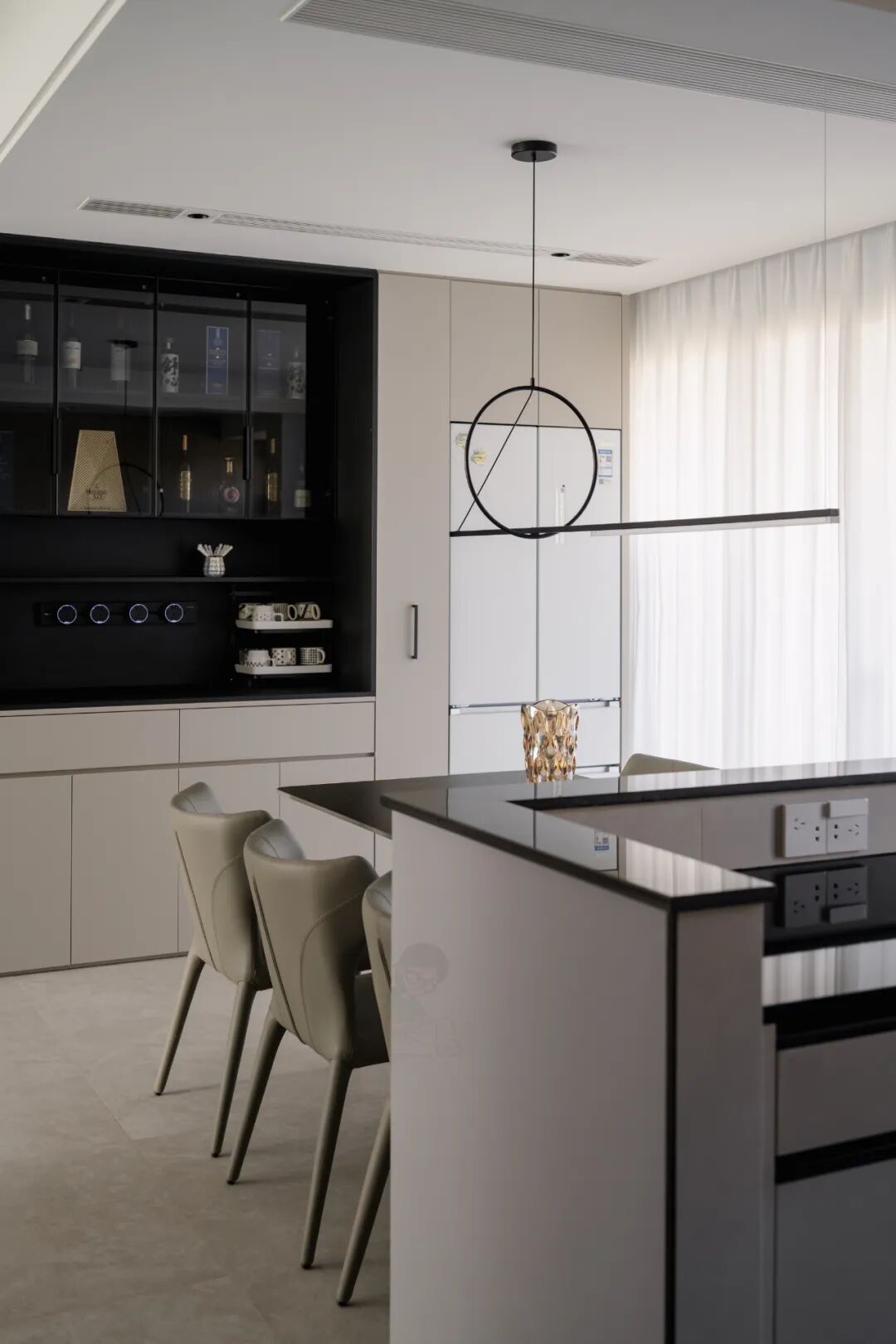开放格上留2-3个带开关五孔插座,供小家电供电,同时方便手机充电。在吊柜底部或开放格内嵌入感应灯带。不仅方便夜间操作,更是营造高级感氛围的神器,让餐边柜在夜晚成为家里温暖的一角。