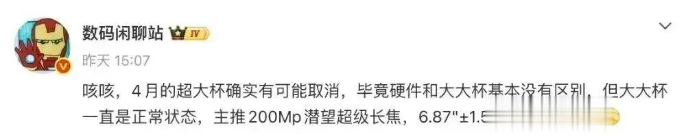 而在此之前,博主@数码闲聊站 的爆料显示,“4月的超大杯确实有可能取消,毕竟硬件和大大杯基本没有区别,但大大杯一直是正常状态,主推200Mp潜望超级长焦,6.87"±1.5K大直屏影像机”。