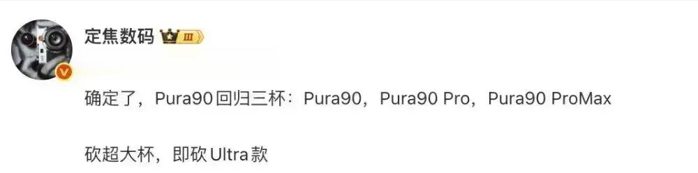 同时,全新的“大大杯”机型将搭载200Mp潜望超级长焦,配备6.87英寸左右的大直屏。博主@定焦数码 近日的一份消息中也提到过,“确定了,Pura90回归三杯:Pura90,Pura90 Pro,Pura90 ProMax。砍超大杯,即砍Ultra款”。