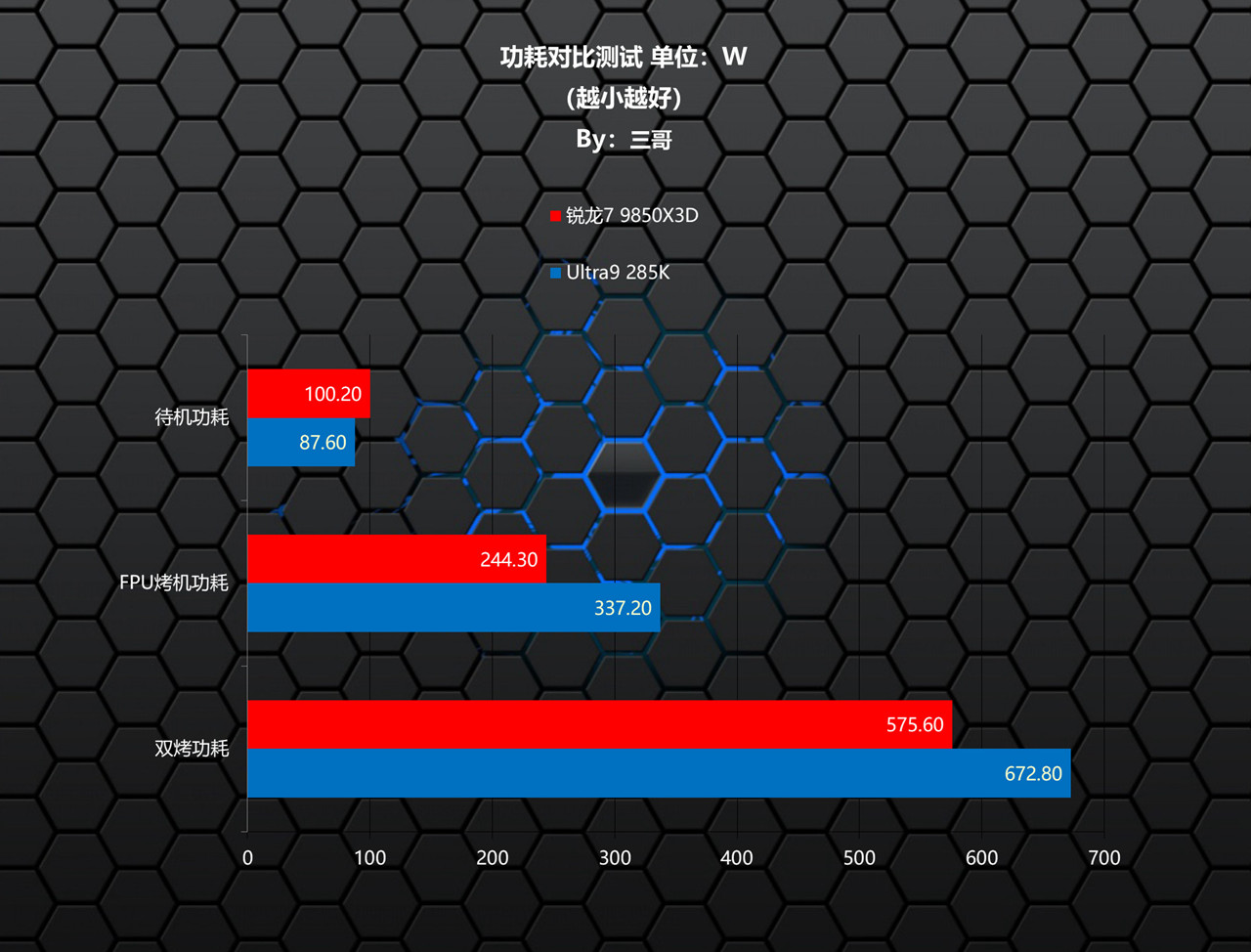 功耗对比测试,和搭配RTX 5090 D时相类似,锐龙7 9850X3D除了待机功耗略高点,FPU烤机功耗和双烤功耗均远低于Ultra9 285K。