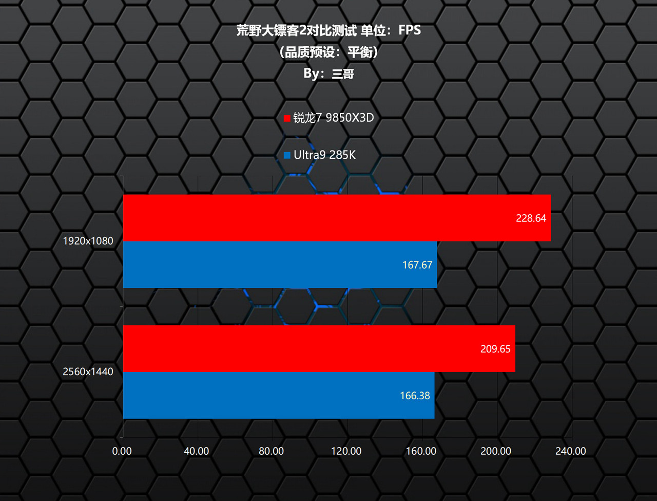 在《荒野大镖客2》测试中,锐龙7 9850X3D相较Ultra9 285K,在两个分辨率下均有非常夸张的领先,其中1080P分辨率下领先了60.97帧,领先比率36.36%;1440P分辨率下领先了43.27帧,领先比率26.01%。