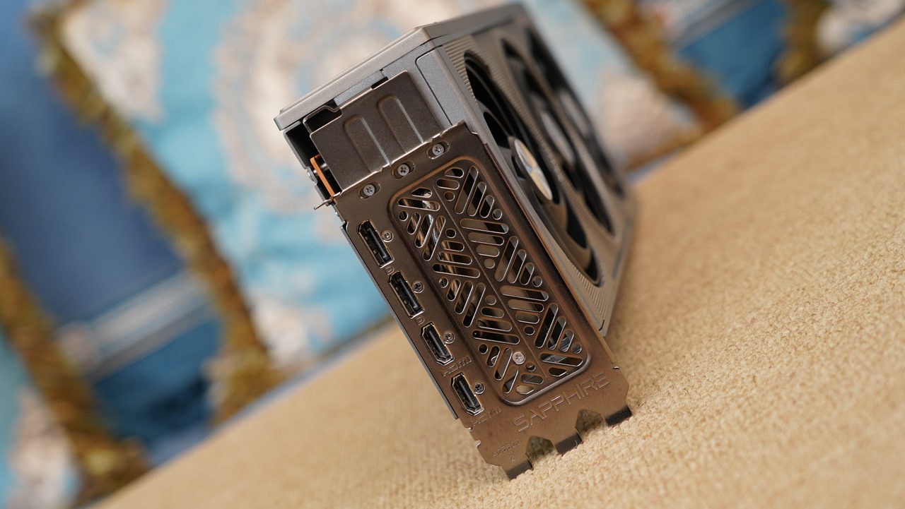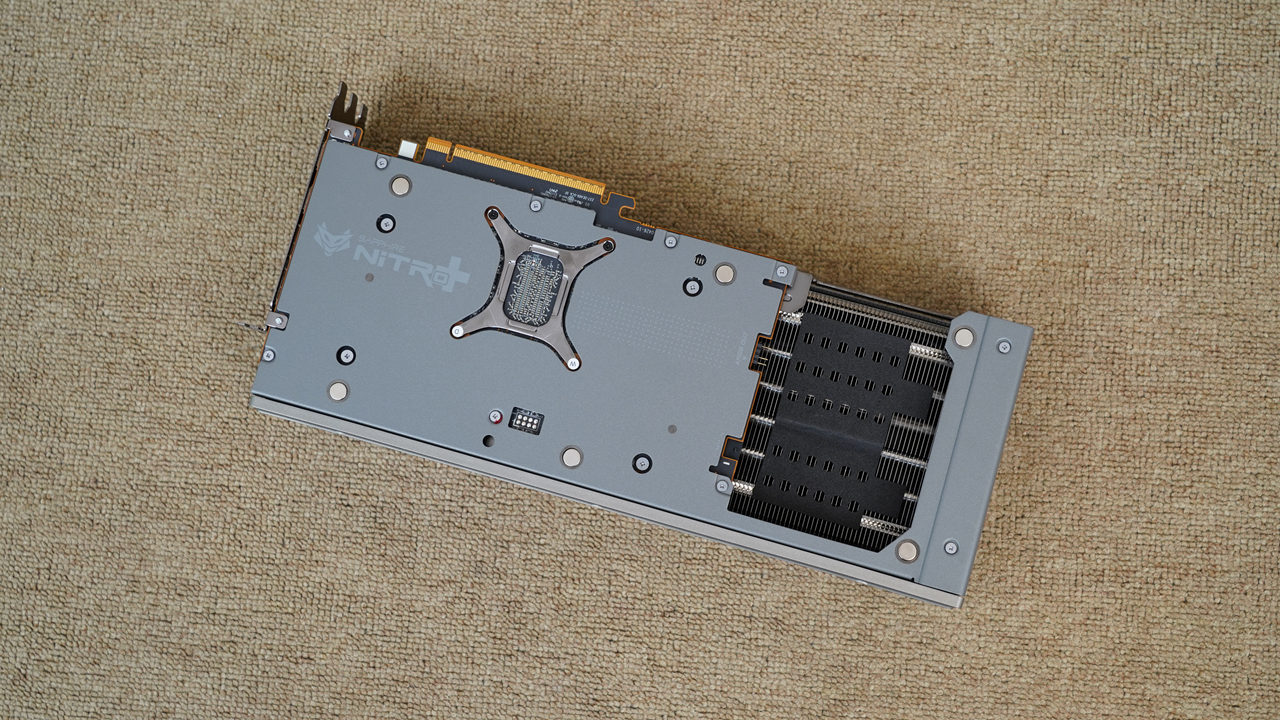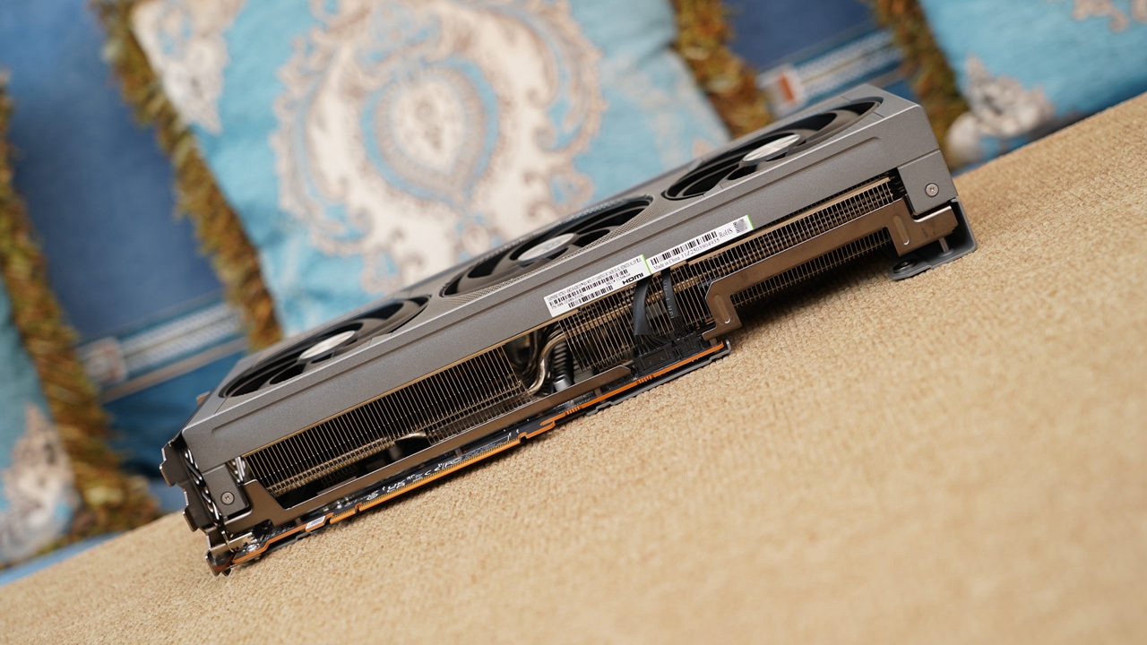 显卡背部一览,显卡尾端采用了开孔设计,能够让气流垂直向上吹出,从而增强散热效果。