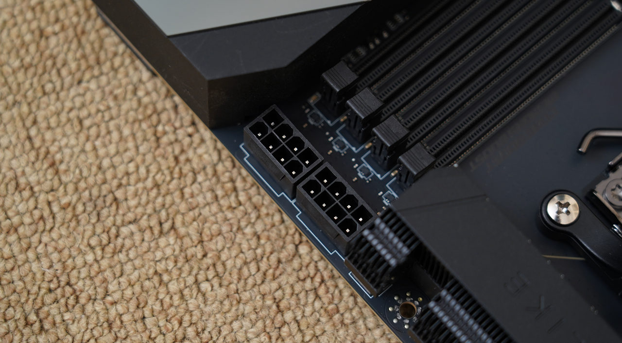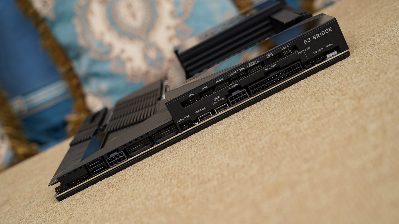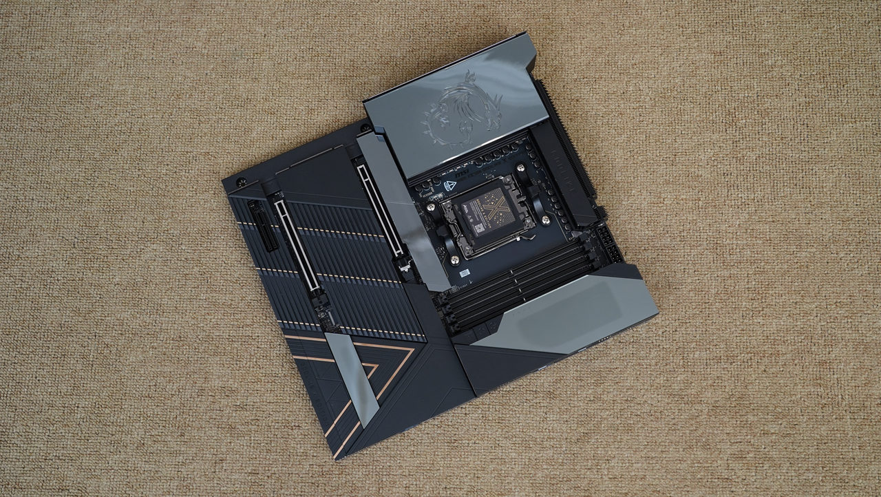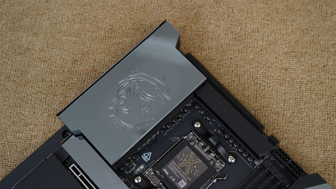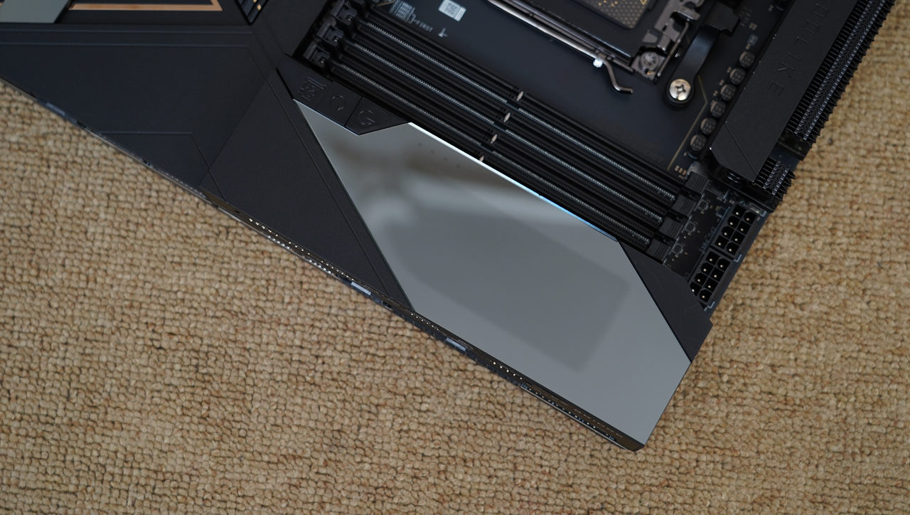主板采用加大号的E-ATX板型,通体采用10层黑色PCB打造,辅以大面积镜面装甲,给人一种简约奢华的感觉。