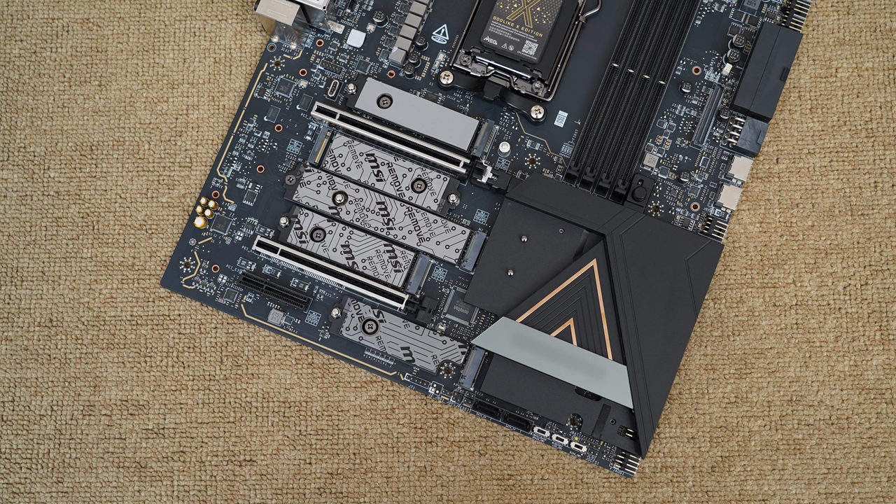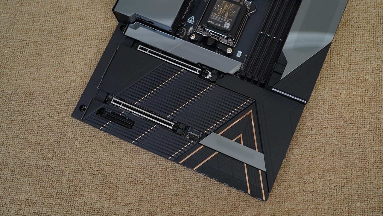 主板的下半部分也采用了全装甲覆盖设计,黑色磨砂散热片看起来质感非常不错,同时也能提供出色的散热效果。